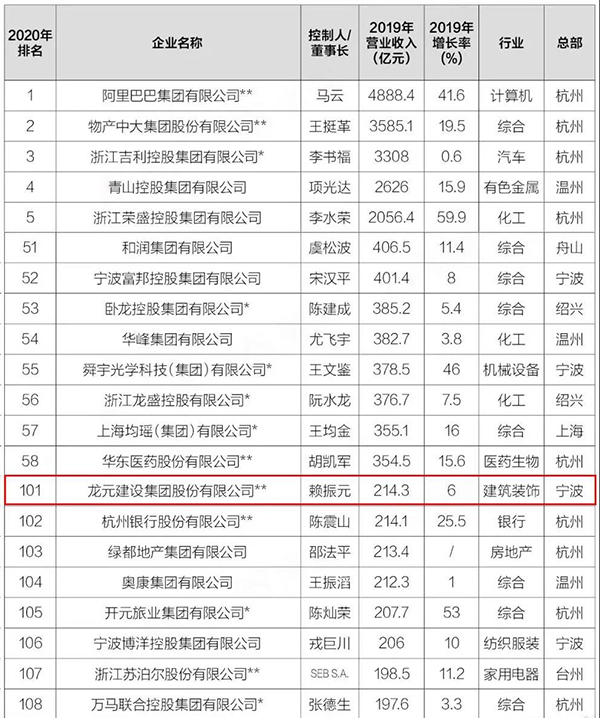 排名101!龍元建設集團榮登浙商全國500強