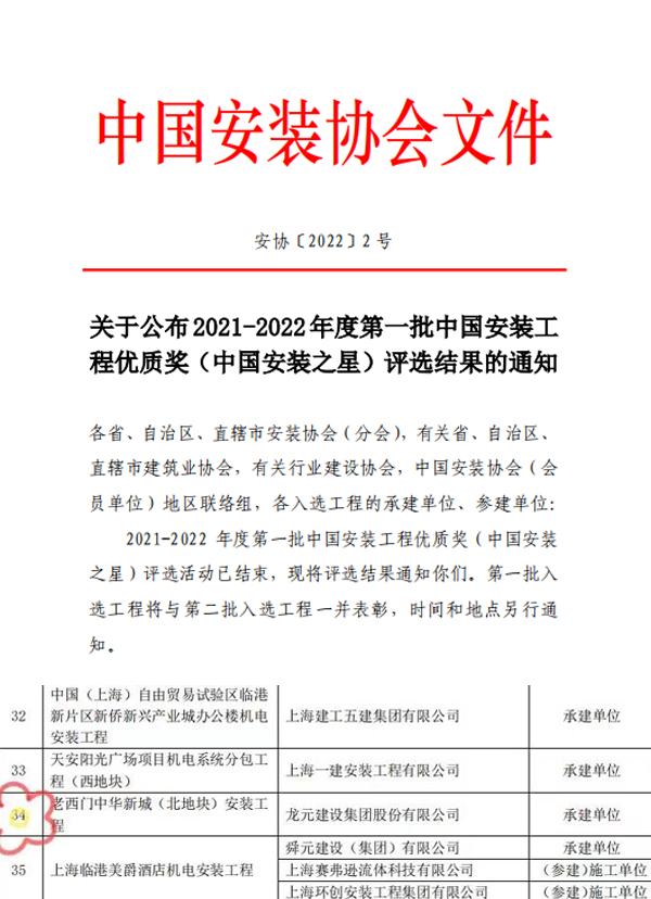 2022年 1 月 7 日,中國安裝協(xié)會(huì)發(fā)布《關(guān)于公布2021-2022年度第一批中國安裝工程優(yōu)質(zhì)獎(jiǎng)(中國安裝之星)評(píng)選結(jié)果的通知》,龍?jiān)瘓F(tuán)承建的老西門中華新城(北地塊)安裝工程榮獲“中國安裝之星”。