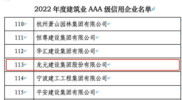 近日,中國建筑業(yè)協(xié)會對430家2022年度建筑業(yè)AAA級信用企業(yè)名單進(jìn)行公示,龍?jiān)ㄔO(shè)集團(tuán)榜上有名。這是我國建筑企業(yè)行業(yè)信用的最高榮譽(yù)。