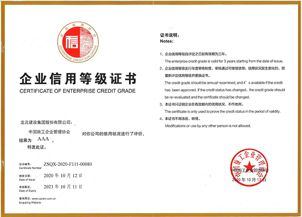 此前,龍?jiān)ㄔO(shè)集團(tuán)曾多次獲得工程建設(shè)企業(yè)社會信用評價(jià)AAA級企業(yè)、浙江省AAA級“守合同重信用”企業(yè)等榮譽(yù)。此次獲評2022年度建筑業(yè)AAA級信用企業(yè),是對公司實(shí)力和信譽(yù)的再度認(rèn)可。